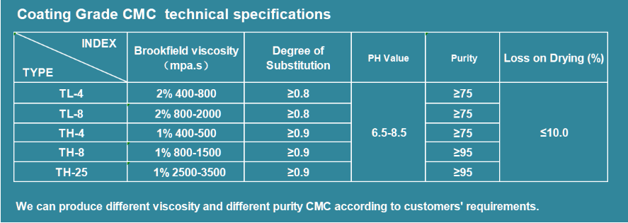 Coating Grade CMC has the excellent compatibility in water or in organic solvent, as well as the pigment. It is used as the thickener, dispersant and stabilizer in coating industry.